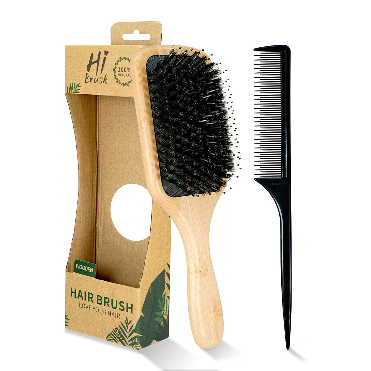 2-in-1 100% Natural Wooden Hair Brush & Rat Tail Comb Set - Professional Bristle Brush for Detangling, Scalp Massage & Hair Care
